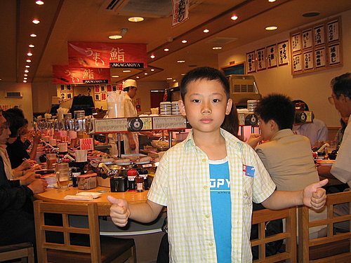 日本的迴轉壽司怎可沒嚐! 看看這個小伙子吃的可滿足的哩!