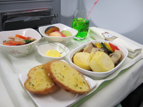 晚餐來了,都是使用高級[瓷器餐具],不像經濟艙都是[塑膠餐具]!